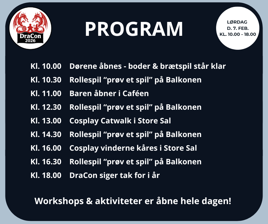 DraCon byder på mange forskellige aktiviteter dagen igennem – fra små kreative workshops til spil, konkurrencer og hyggelige fælles oplevelser. .